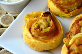 Płat ciasta rozwijamy, wygładzamy i smarujemy ketchupem, na ketchup układamy szynkę, potem farsz porowy, na końcu mozzarellę i całość posypujemy pieprzem ziołowym.Ciasto zwijamy wzdłuż dłuższego boku, a potem kroimy w około 5 cm plastry, układamy je na blaszce wyłożonej papierem do pieczenia.